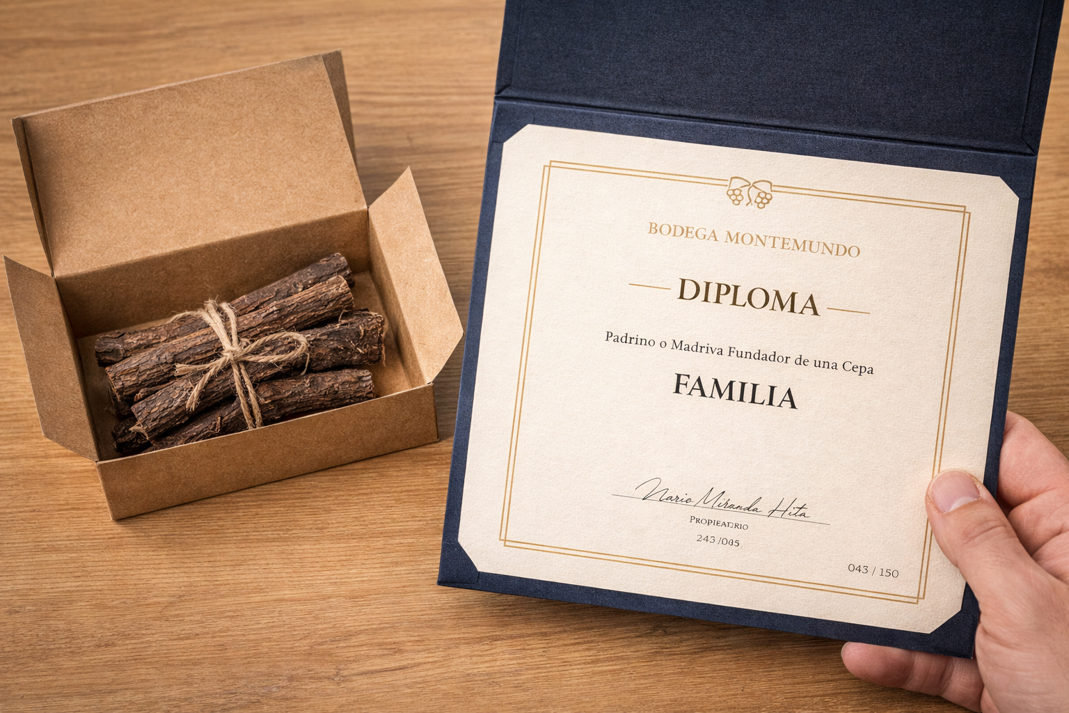 Incluye placa personalizada en el viñedo, diploma numerado, visita y cata para dos personas y 3 botellas entregadas el día de la experiencia.